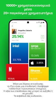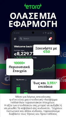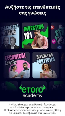 Η eToro μεταμορφώνει τον τρόπο που επενδύετε, προσφέροντας έναν κόσμο ευκαιριών στην παλάμη του χεριού σας. Ανακαλύψτε μια κορυφαία πλατφόρμα πολλαπλών περιουσιακών στοιχείων, σχεδιασμένη για να κάνει τις επενδύσεις προσβάσιμες σε όλους. Εξερευνήστε χιλιάδες μετοχές από 20 κορυφαία χρηματιστήρια παγκοσμίως, όλα διαθέσιμα μέσω του διαισθητικού περιβάλλοντος της eToro. Είτε είστε αρχάριος είτε έμπειρος επενδυτής, να θυμάστε ότι η αξία των επενδύσεών σας μπορεί να αυξηθεί ή να μειωθεί.