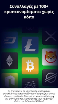 Βυθιστείτε στον συναρπαστικό κόσμο των κρυπτονομισμάτων με την eToro, έναν παγκόσμιο πρωτοπόρο στην τεχνολογία blockchain. Αποκτήστε Bitcoin, Ethereum, XRP και μια πληθώρα άλλων κορυφαίων κρυπτονομισμάτων χωρίς προμήθειες κατάθεσης, επωφελούμενοι από ευέλικτες επιλογές πληρωμής. Ωστόσο, να θυμάστε ότι τα κρυπτοστοιχεία είναι εξαιρετικά ευμετάβλητα μέσα, τα οποία μπορούν να παρουσιάσουν μεγάλες διακυμάνσεις σε σύντομο χρονικό διάστημα. Η αγορά κρυπτονομισμάτων δεν ρυθμίζεται στις περισσότερες χώρες της ΕΕ και στο ΗΒ και, ως εκ τούτου, δεν εποπτεύεται από το κανονιστικό πλαίσιο της ΕΕ και δεν παρέχει καμία προστασία. Πέρα από τις αγορές, η eToro είναι ένα ζωντανό οικοσύστημα όπου μπορείτε να συνδεθείτε με εκατομμύρια επενδυτές. Μοιραστείτε ιδέες, συζητήστε στρατηγικές και επωφεληθείτε από την καινοτόμο τεχνολογία CopyTrader™ της eToro, η οποία σας επιτρέπει να αναπαράγετε αυτόματα τις κινήσεις των πιο επιτυχημένων επενδυτών. Η αντιγραφή συναλλαγών δεν ισοδυναμεί με επενδυτική συμβουλή.